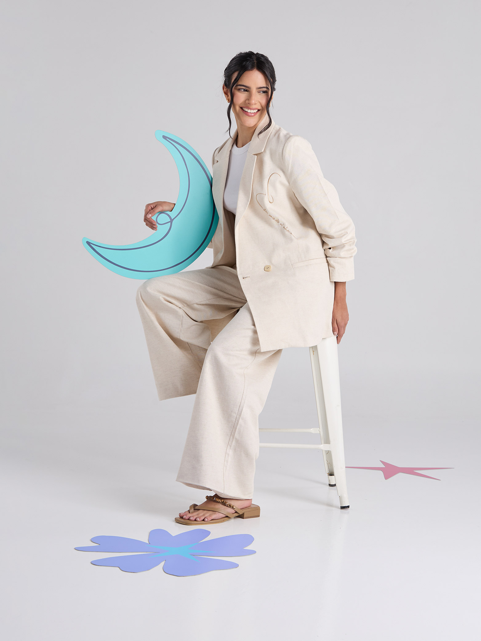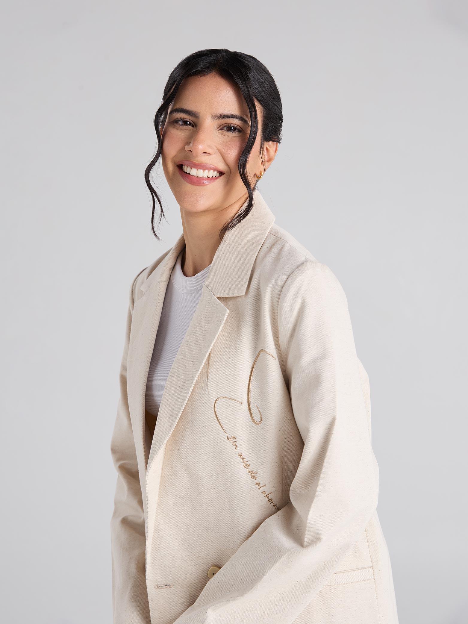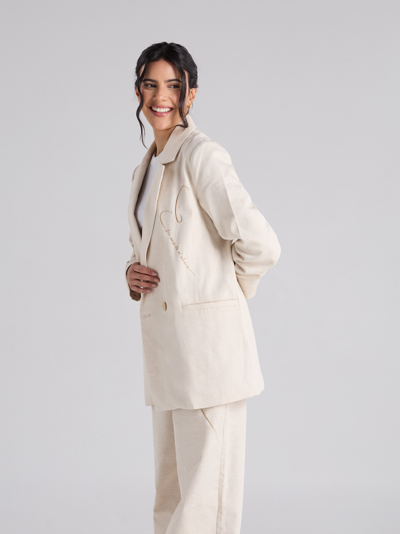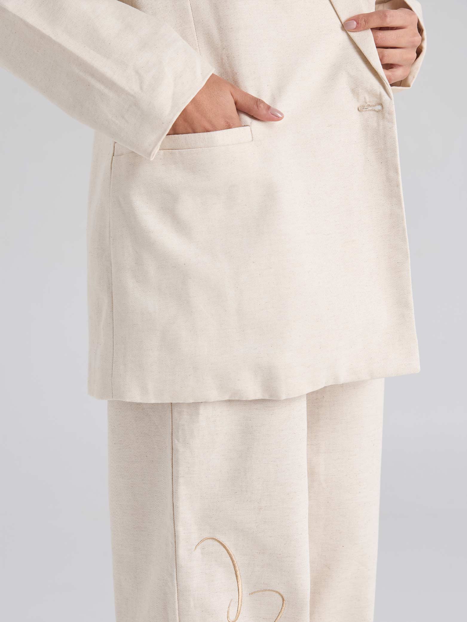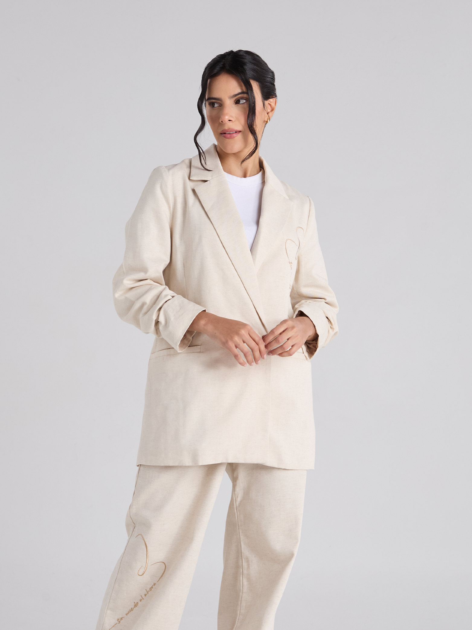 Blazer arena de cuello y solapa clásica, con manga larga. Presenta bolsillos delanteros de ribete, cierre frontal con botón y arte bordado en el delantero.