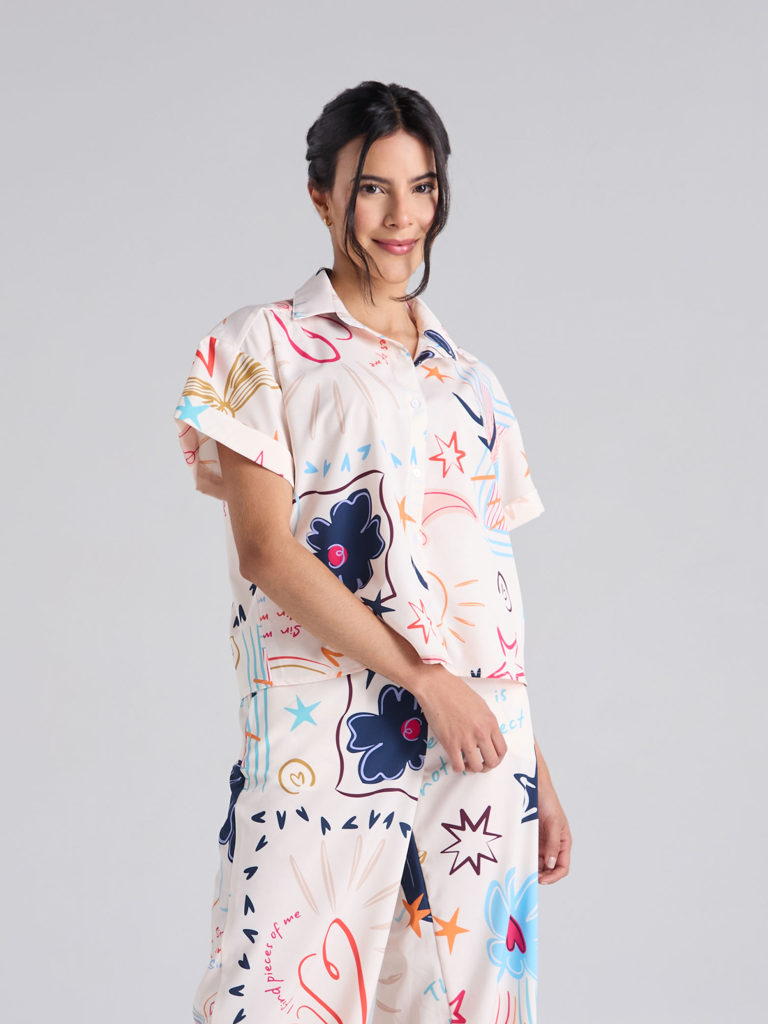 Camisa corta estampada marfil con cuello clásico estructurado, manga corta y botonadura central.