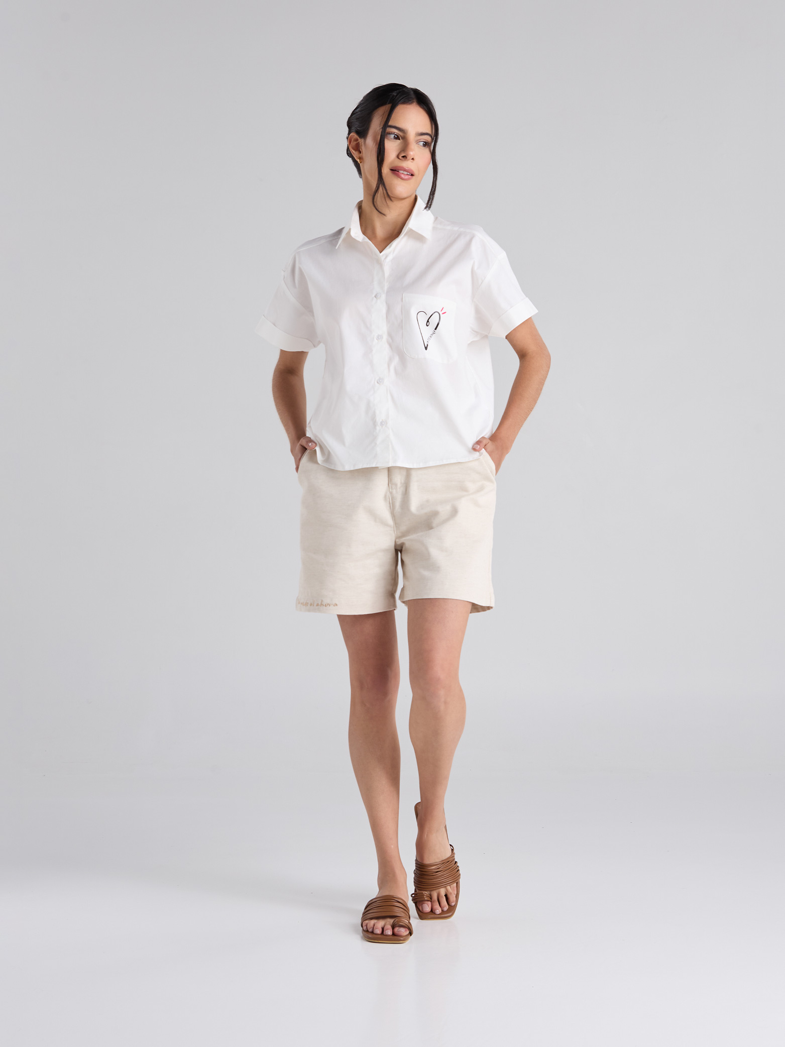 Camisa corta en tono marfil con estampado. Presenta cuello clásico estructurado, manga corta, botonadura central y detalles estampados en el bolsillo delantero y la almilla.