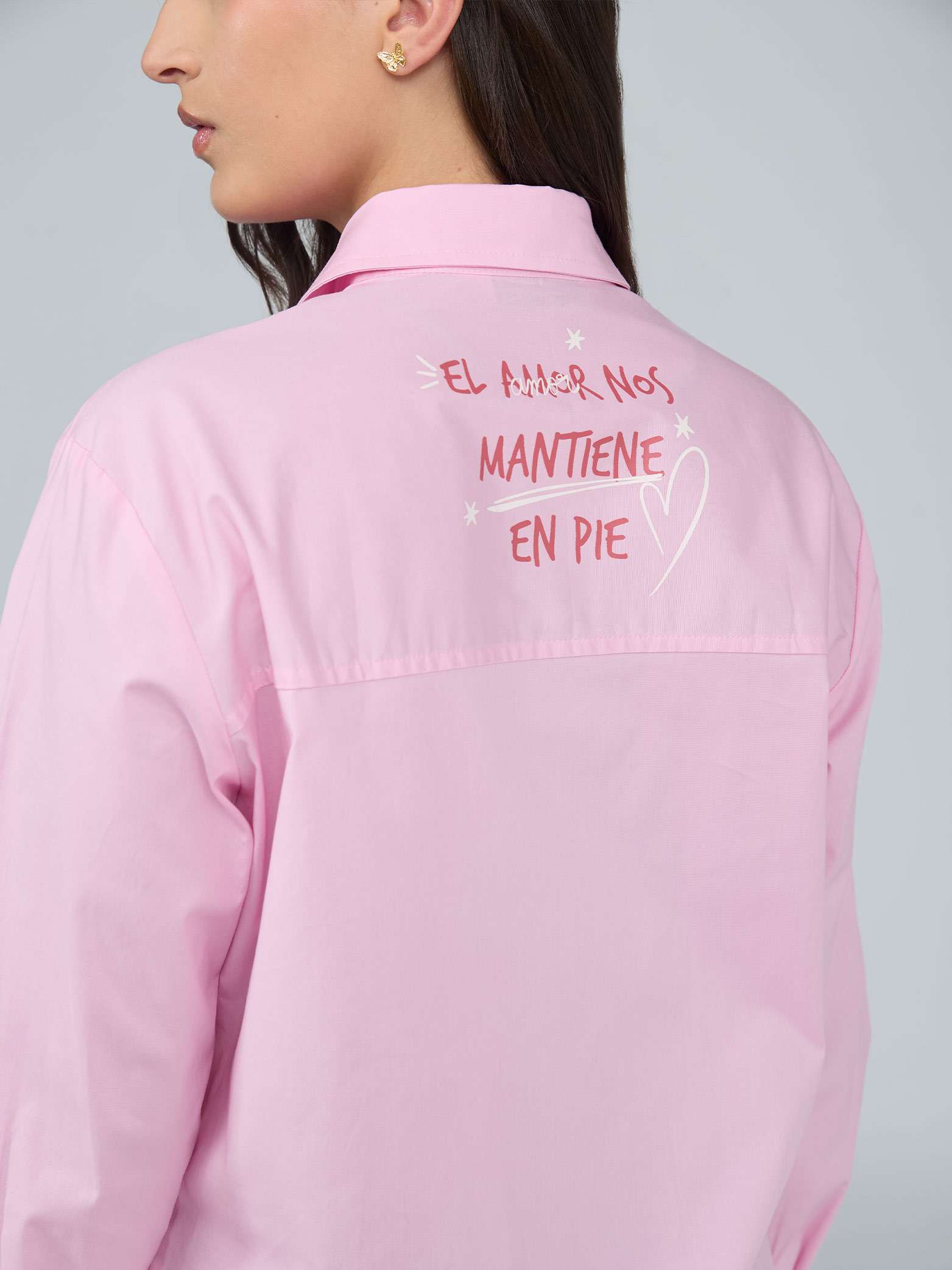 Camisa rosada de cuello clásico y cierre frontal con botones. Manga larga con prenses en los puños abotonados, bolsillo en el delantero y almilla en la espalda. Presenta estampado gráfico en el bolsillo y en la almilla. Esta prenda hace parte de una colaboración especial con la Fundación AMESE, en apoyo a mujeres que enfrentan el cáncer de mama. Por la compra de este producto, se donará el 10% a la fundación.