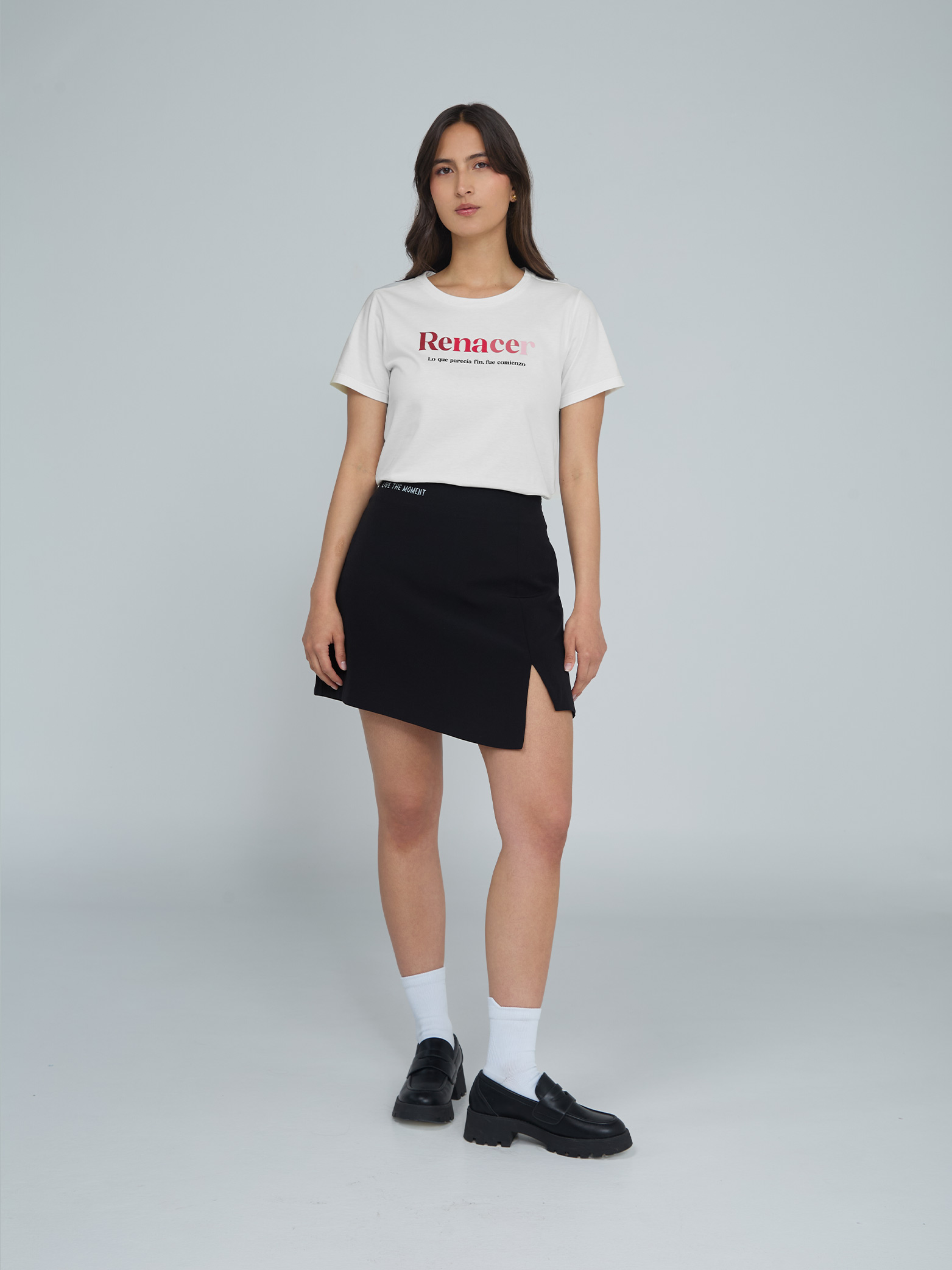 Camiseta marfil de cuello redondo y manga corta, con estampado en el delantero. Esta prenda hace parte de una colaboración especial con la Fundación AMESE, en apoyo a mujeres que enfrentan el cáncer de mama. Por la compra de este producto, se donará el 10% a la fundación.