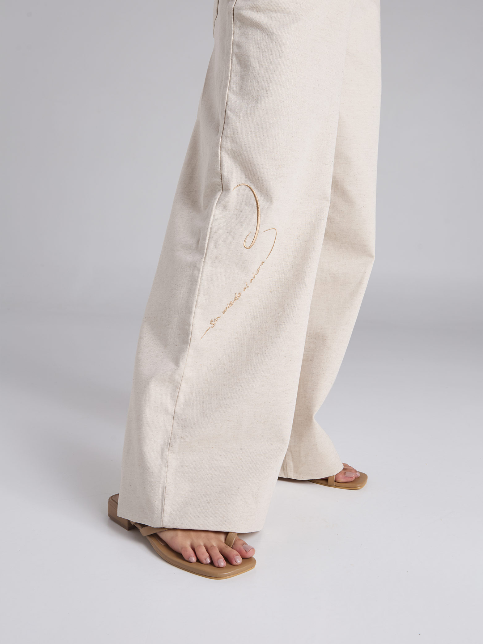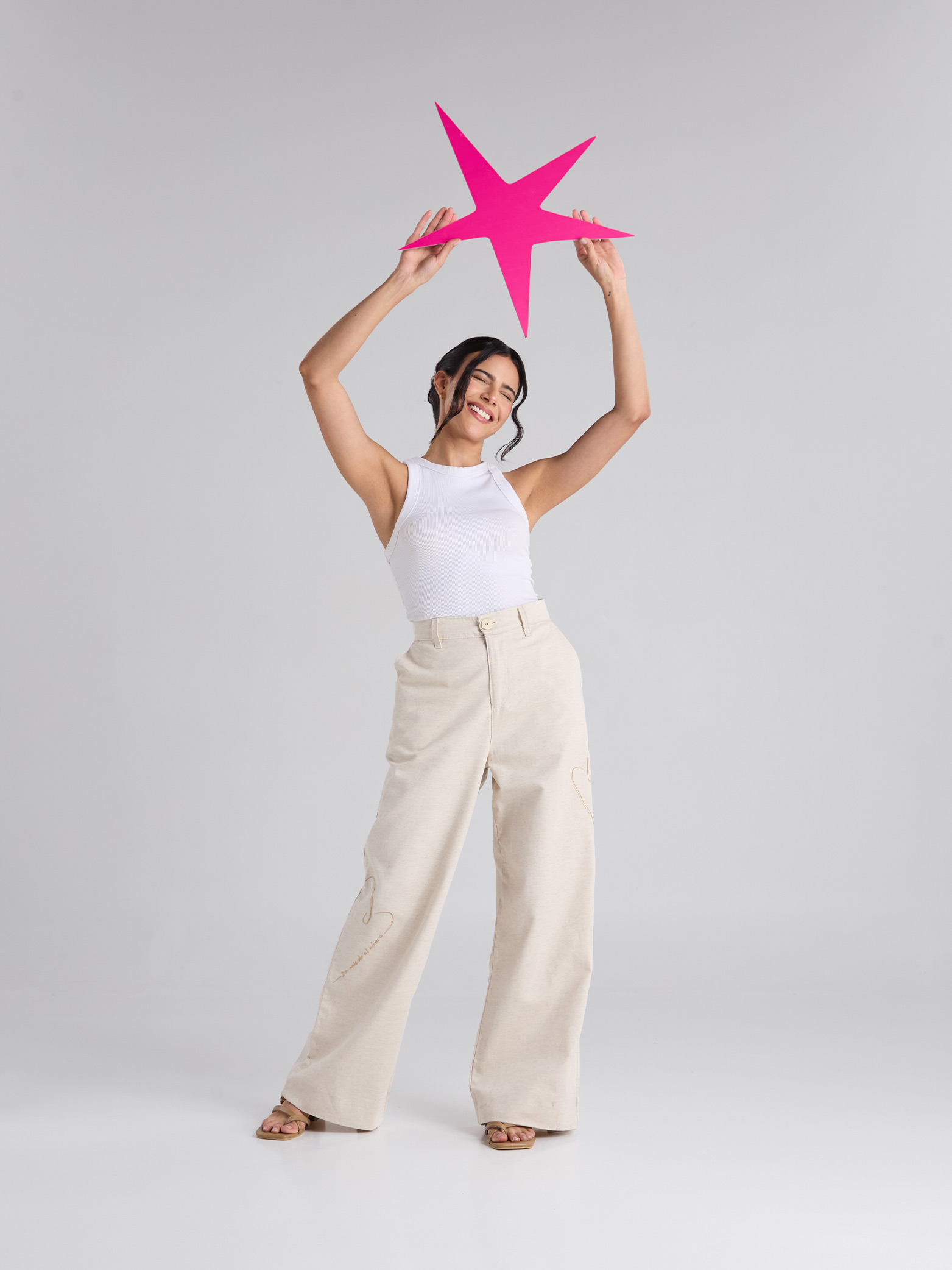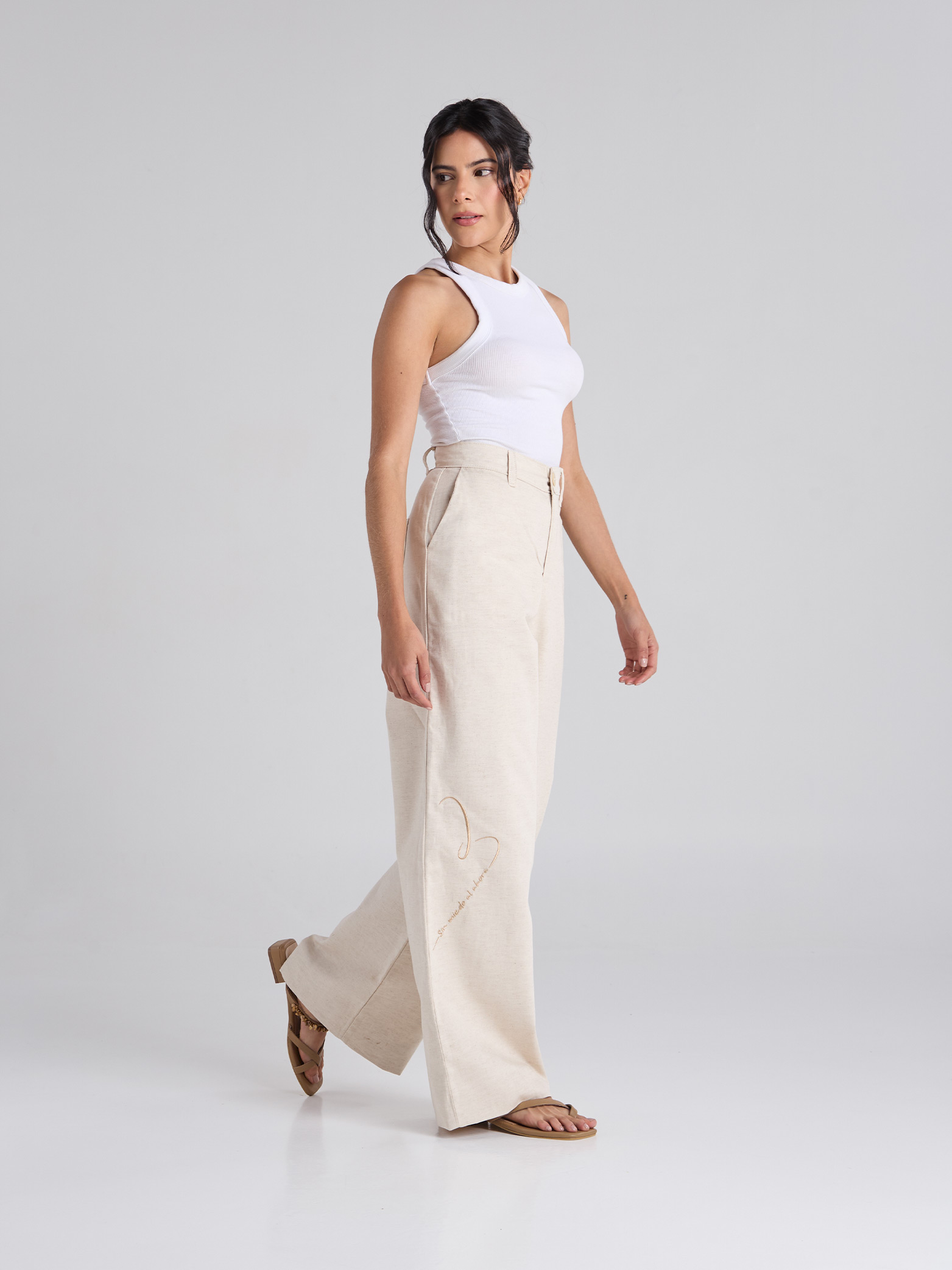 Pantalón arena wide leg de tiro alto. Cuenta con cuatro bolsillos: dos delanteros tipo “L” y dos tipo parche en la parte posterior. Presenta pasadores en la cintura, cierre frontal con cremallera y botón, y arte gráfico bordado en los delanteros.