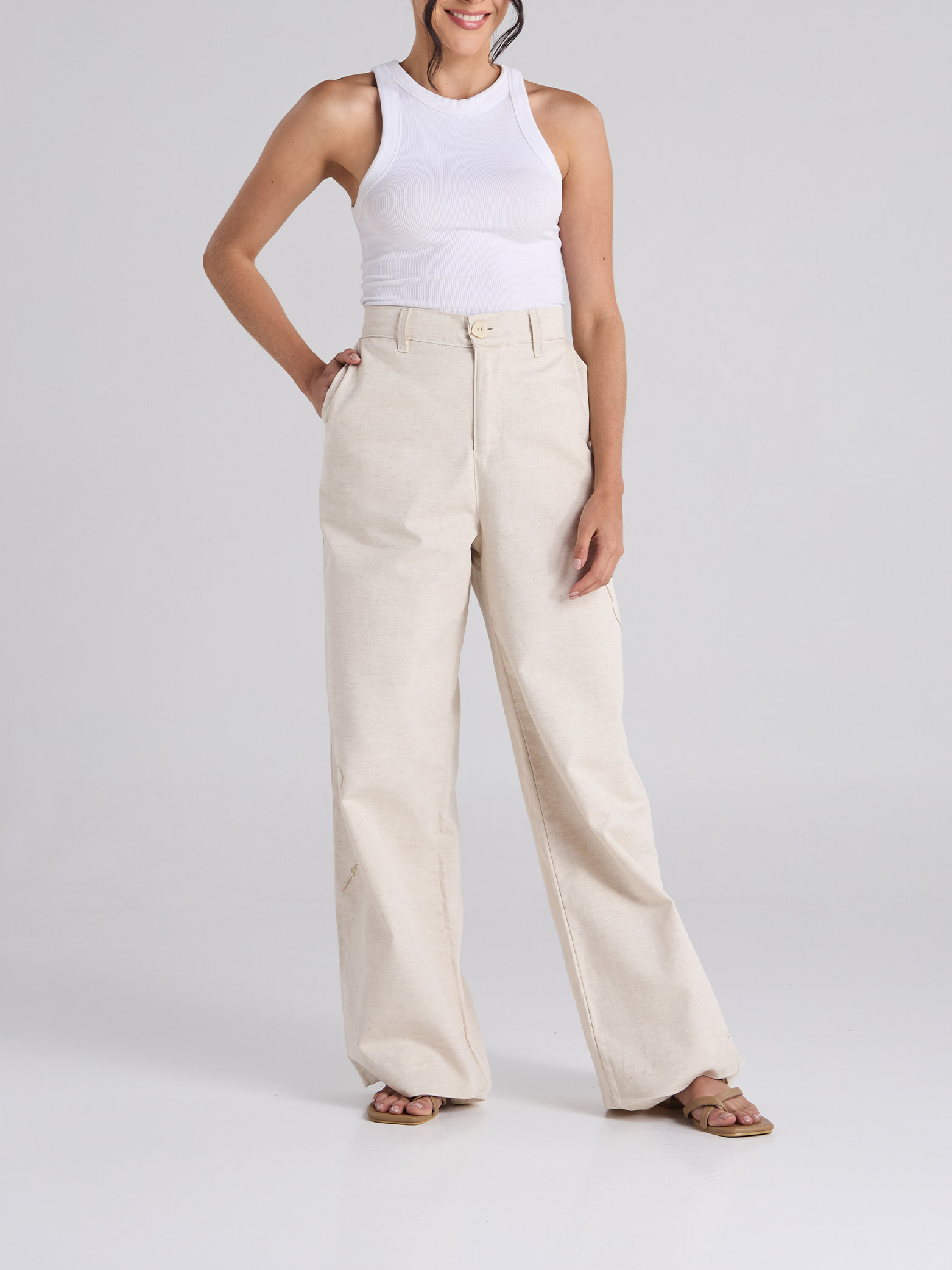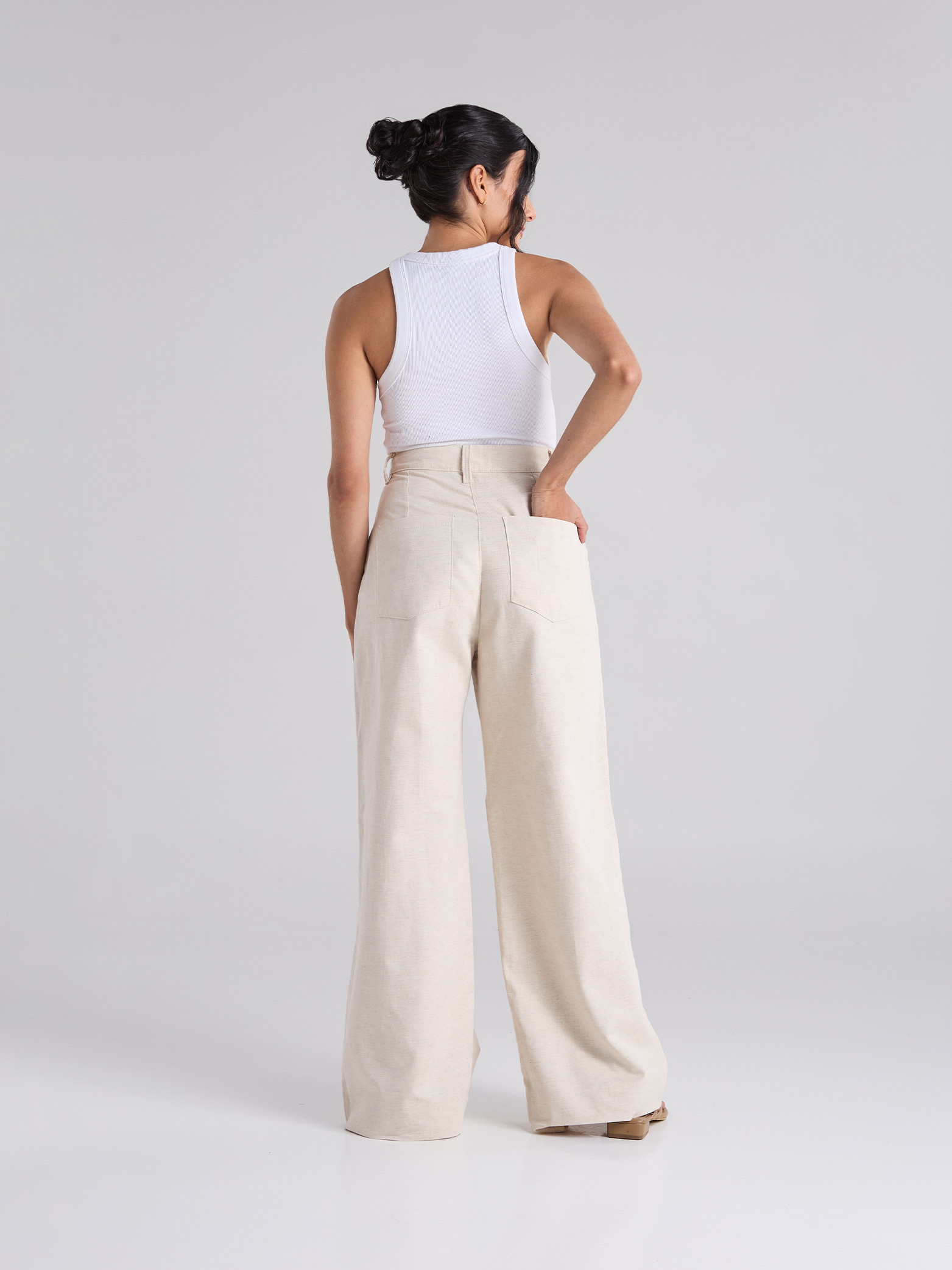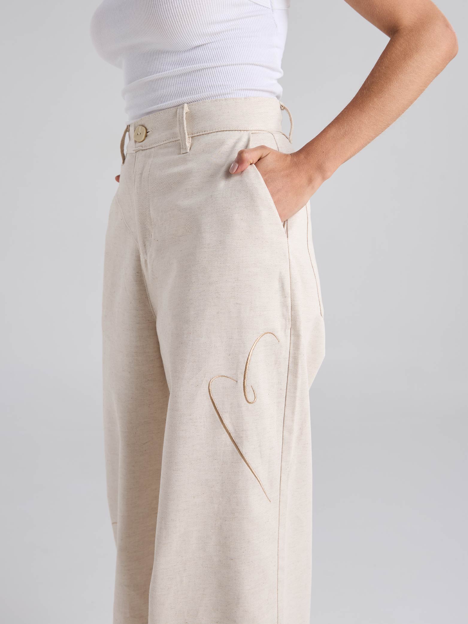 Pantalón arena wide leg de tiro alto. Cuenta con cuatro bolsillos: dos delanteros tipo “L” y dos tipo parche en la parte posterior. Presenta pasadores en la cintura, cierre frontal con cremallera y botón, y arte gráfico bordado en los delanteros.