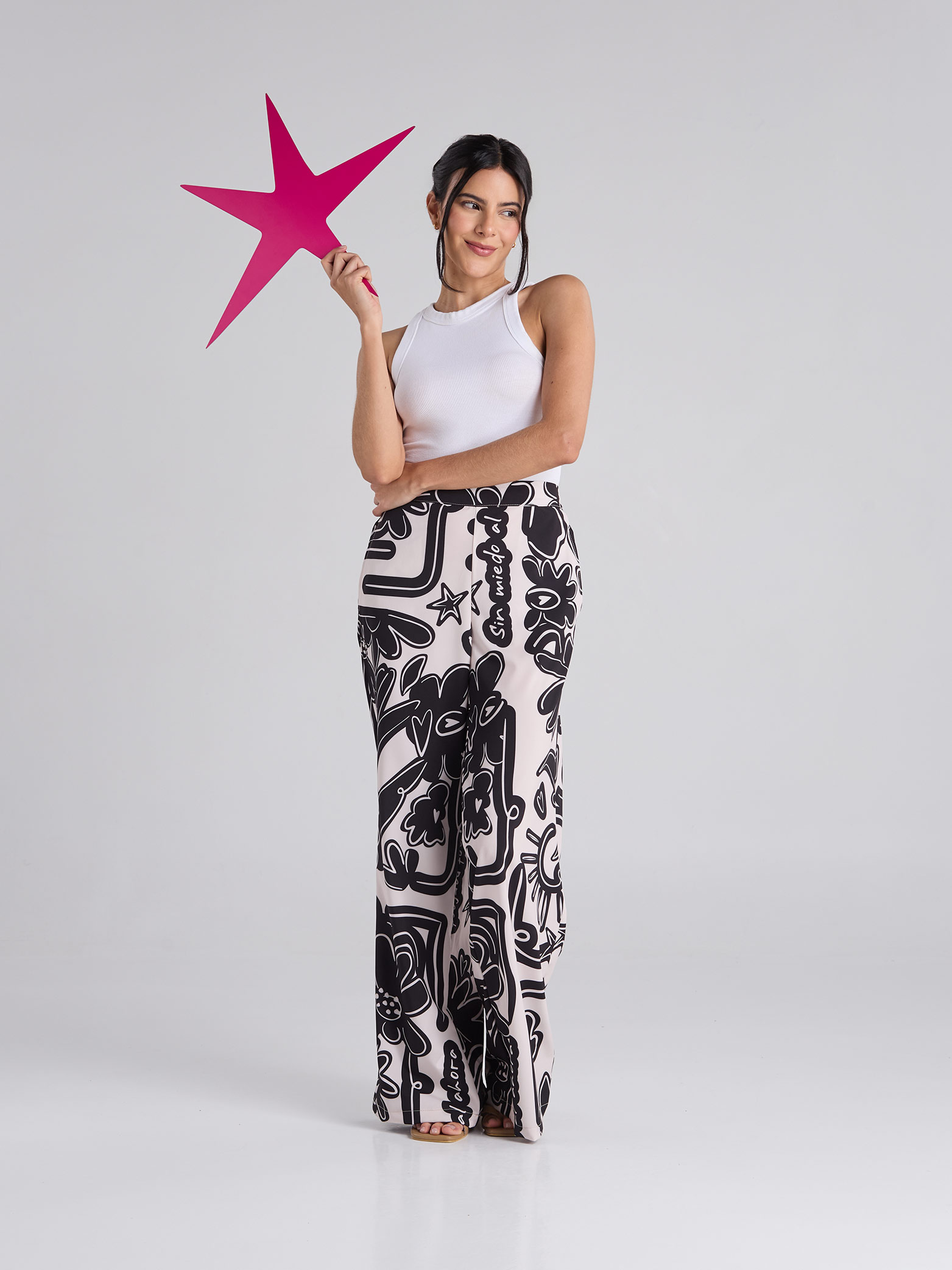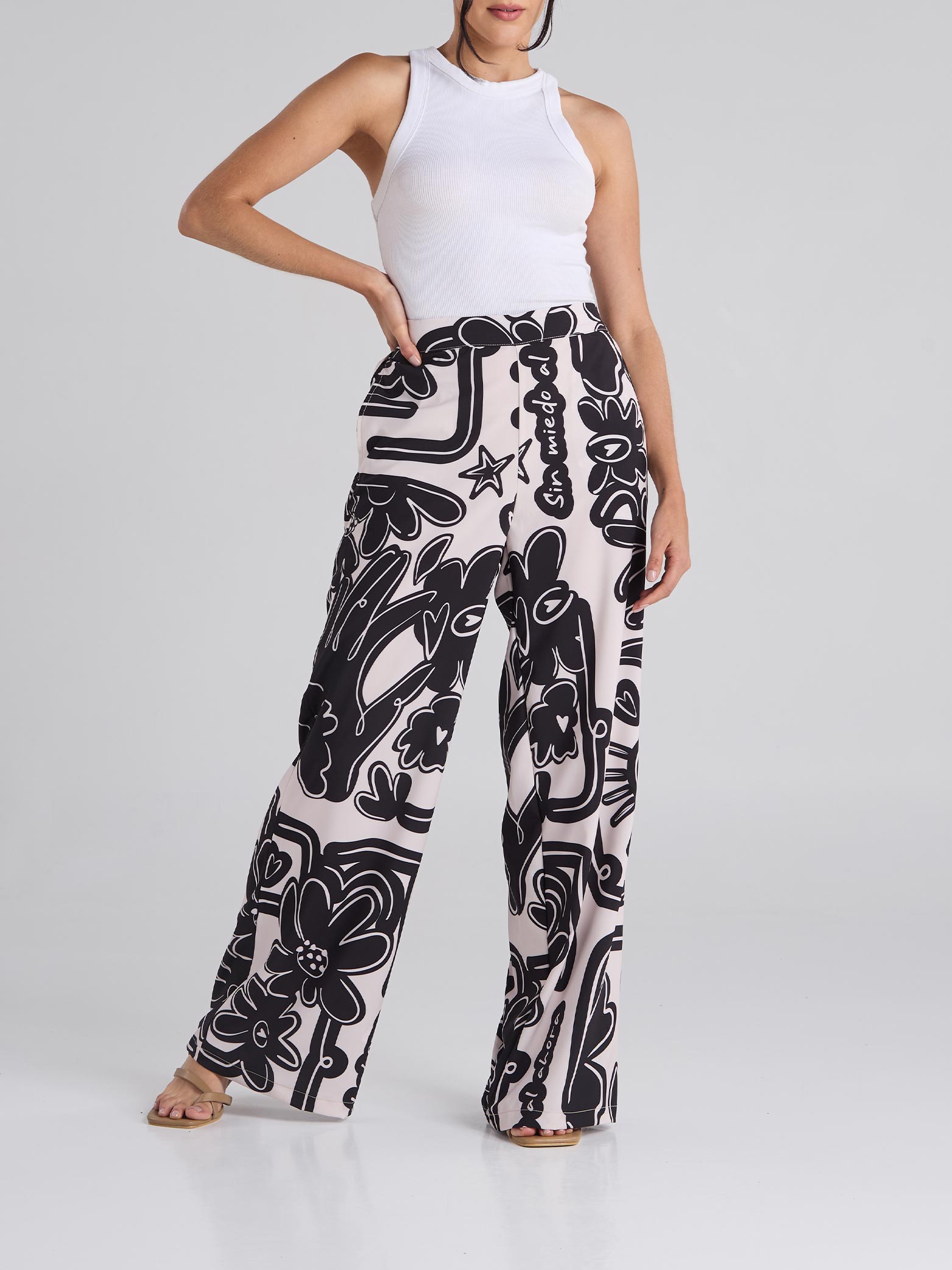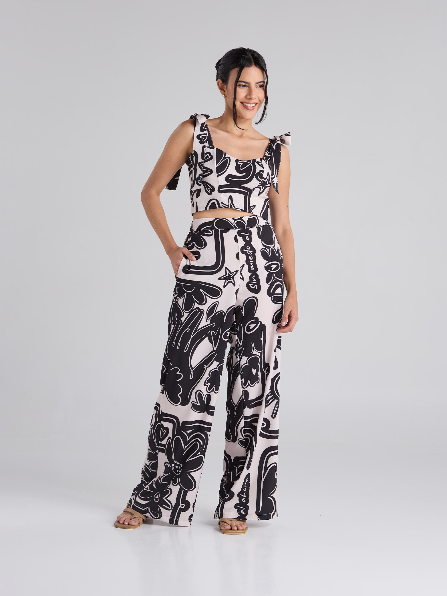 Pantalón estampado en tono arena, de corte recto, con bolsillos delanteros funcionales y pretina semiresortada.