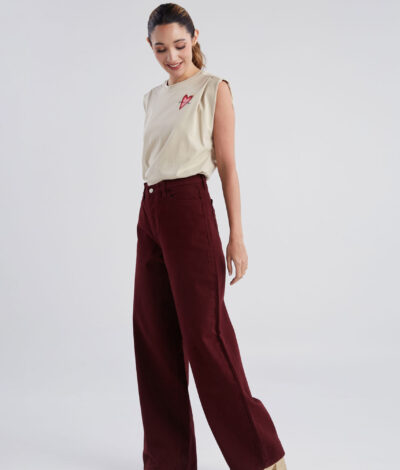 Pantalón café estampado de silueta wide leg y tiro alto. Cuenta con cinco bolsillos: tres en el delantero y dos tipo parche en la parte posterior. Cierre frontal con cremallera y botón.