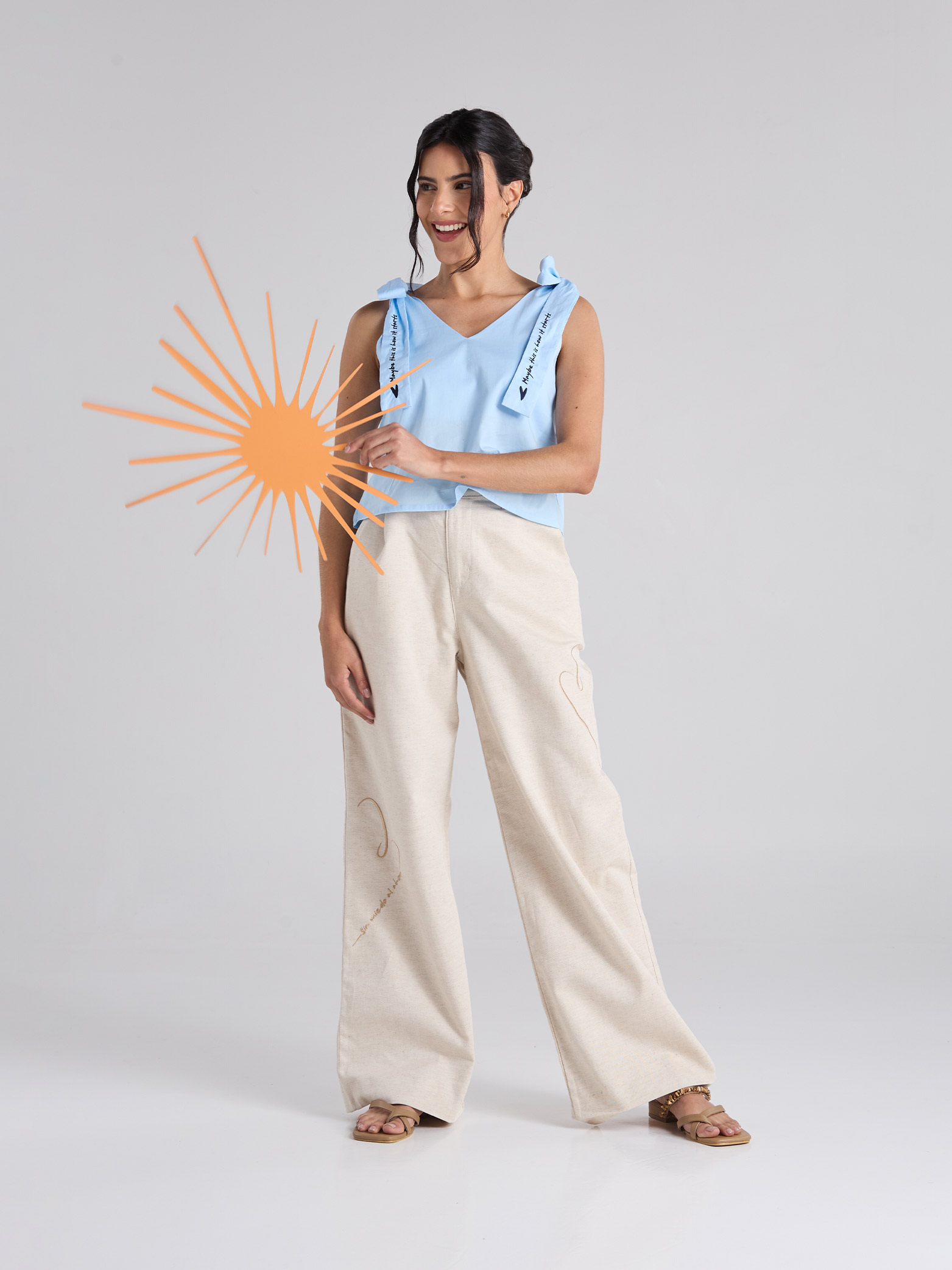 Top azul con escote en “V” en delantero y espalda. Tirantes largos ajustables con detalle bordado en los lazos.