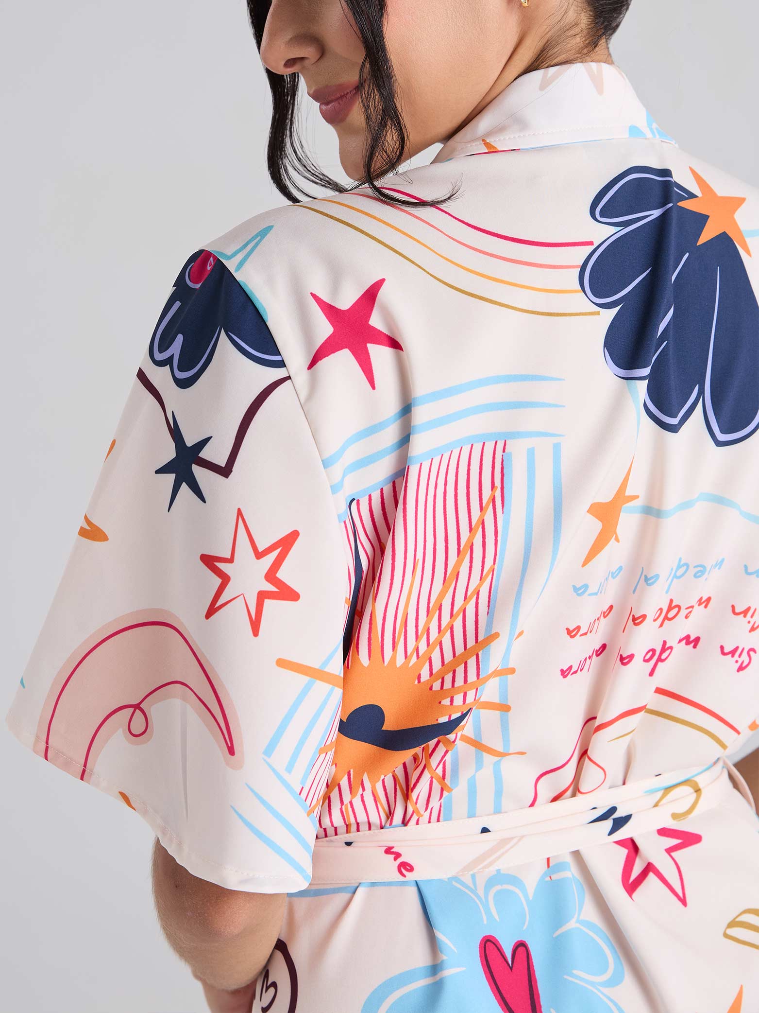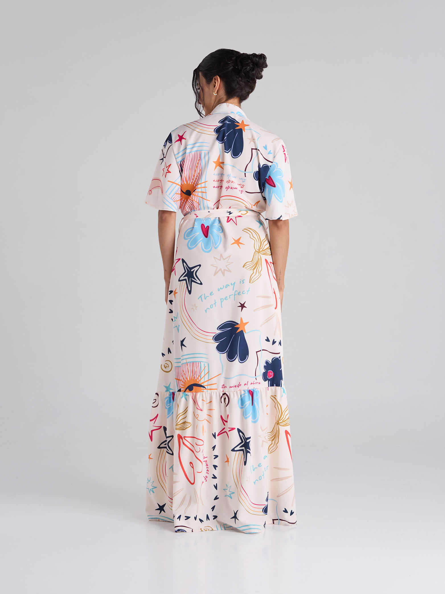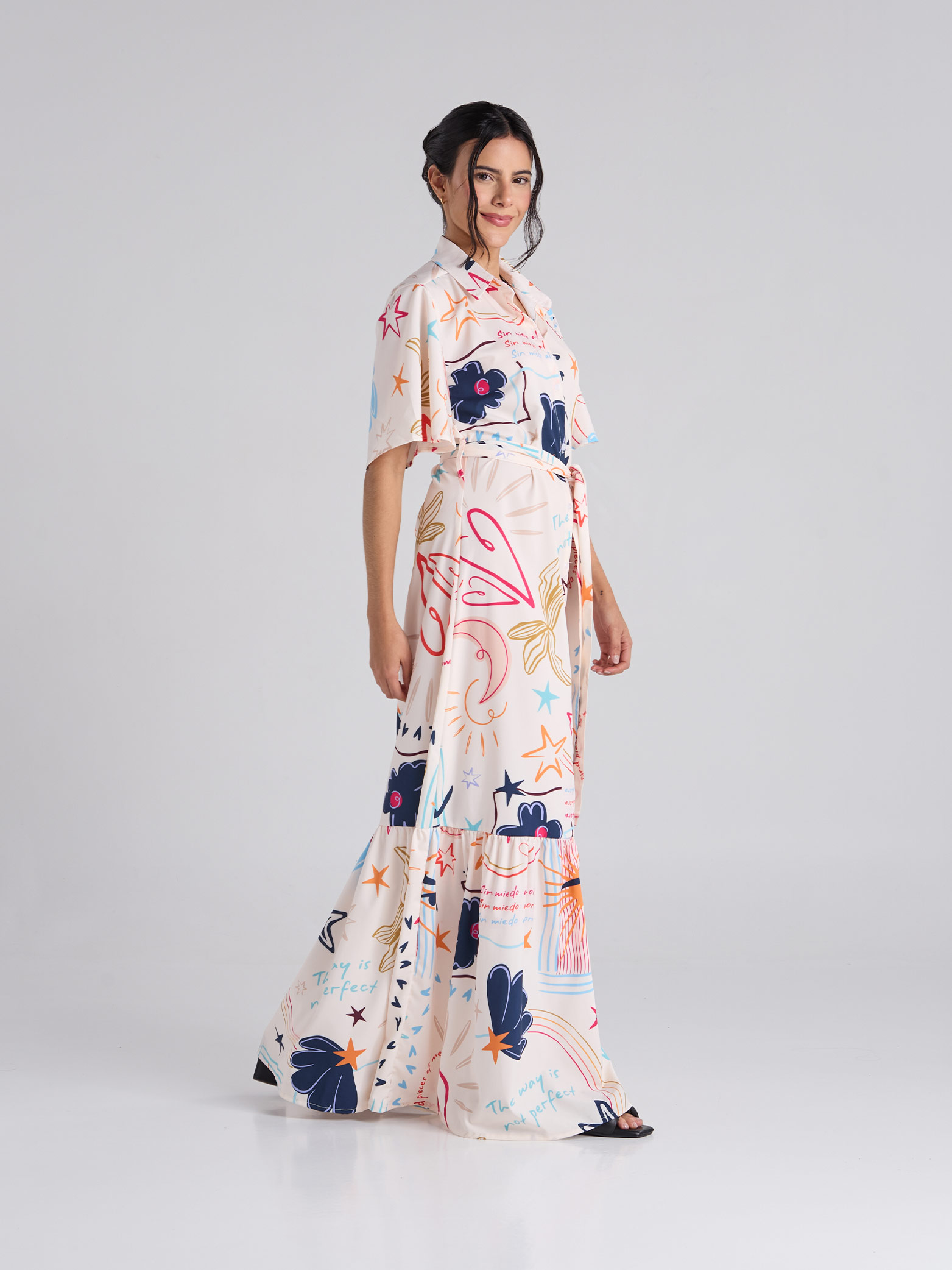 Vestido camisero marfil largo de cuello clásico y cierre frontal con botones. Manga corta, bolero en la parte inferior, dos pasadores en los costados y cinturón removible.